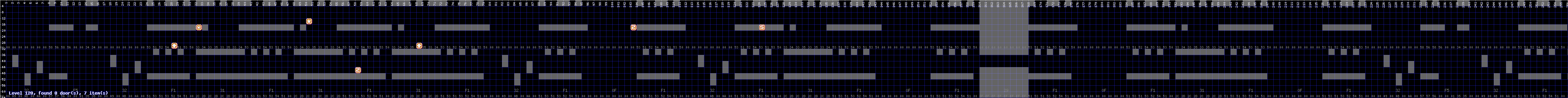 Zone 120 (a number well above the 100 normal levels in the game) cannot be accessed without hacking the game, and contains 7 items - the maximum normally allowed in any level is 4. There is no level layout data or doors. The seven items are, in order from left to right: Score-Up, Microphone, Invincibilty, 2x Points, Score-Up, 2x Points, and Super Bombs.
